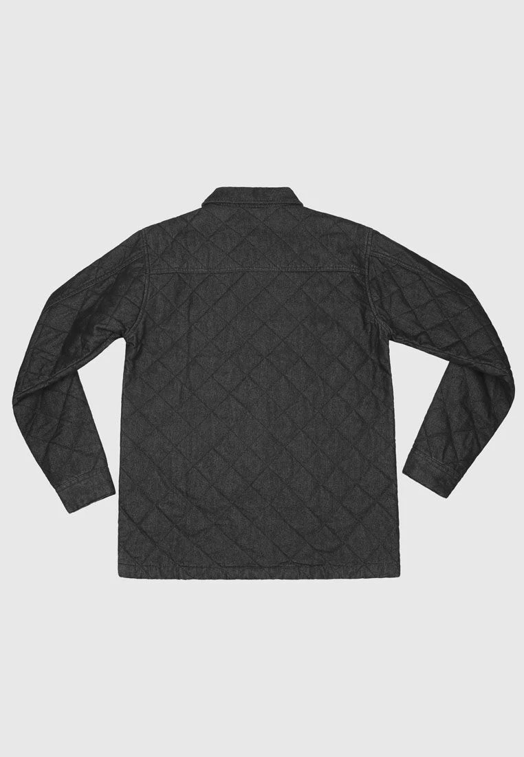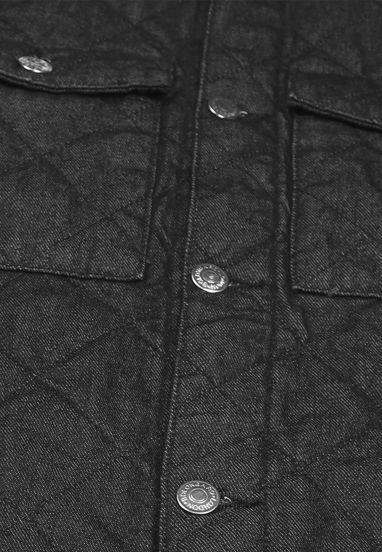 Button down washed denim collared shirt with chest pockets in quilted design.