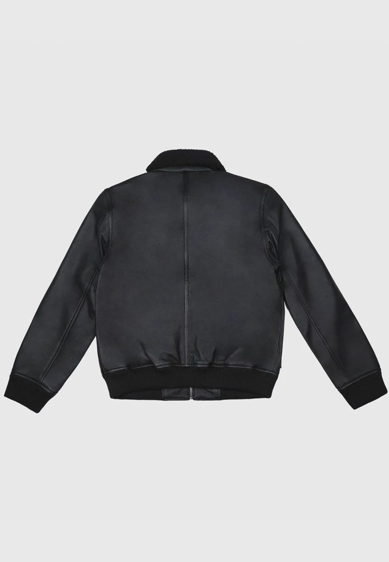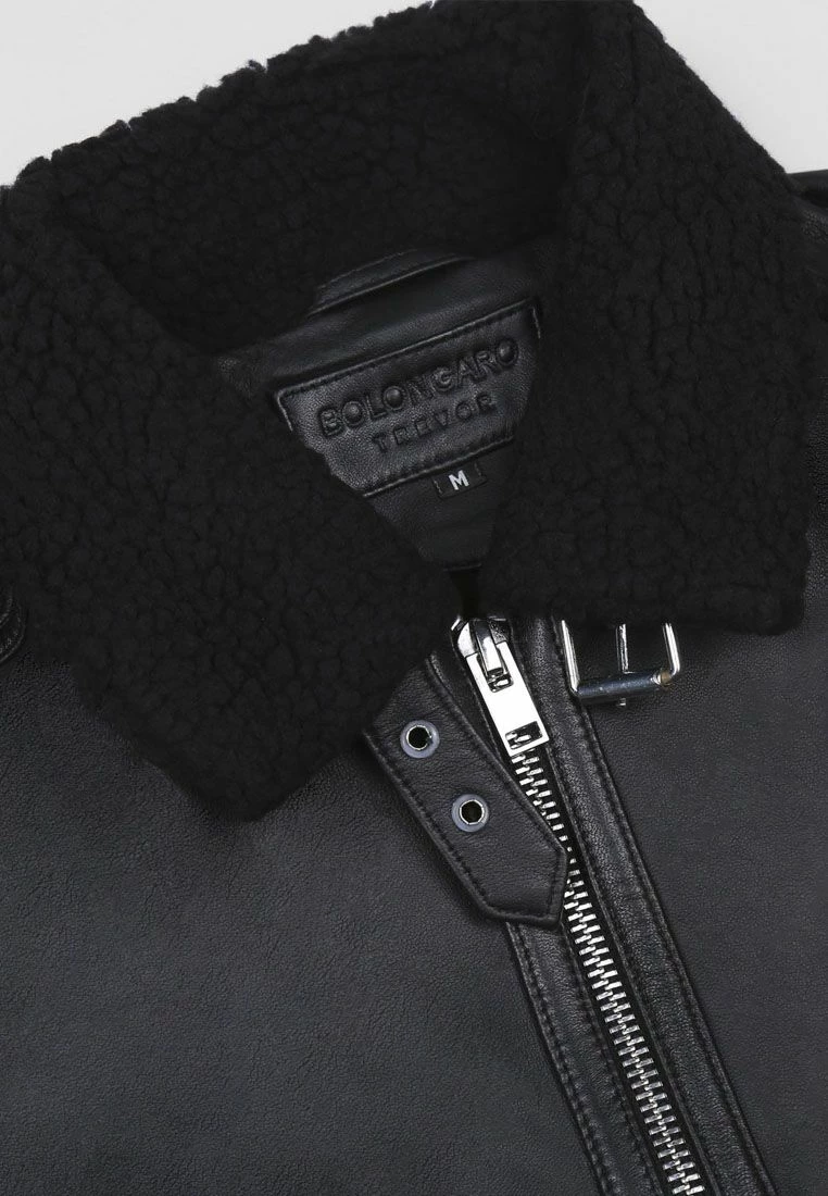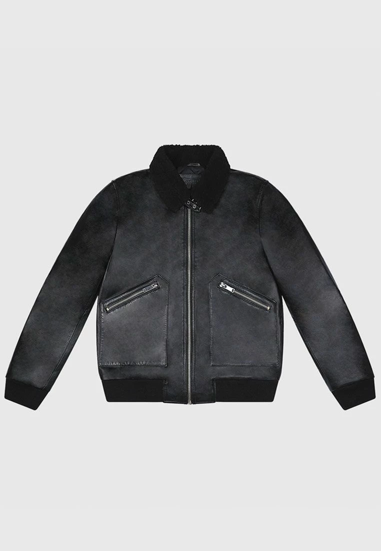 Zip up leather bomber jacket with borg shearling collar.