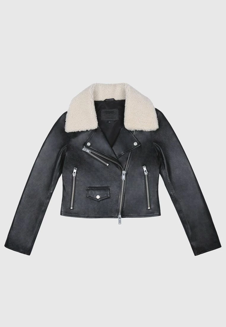 Classic leather biker jacket with shearling collar.