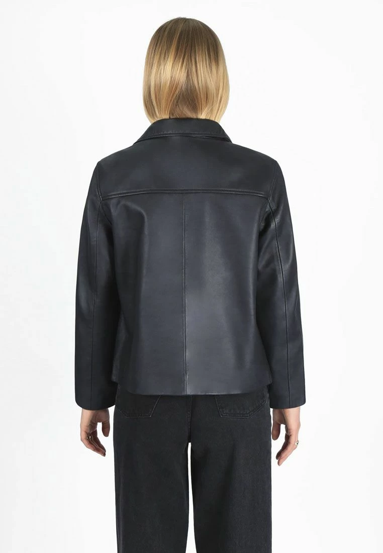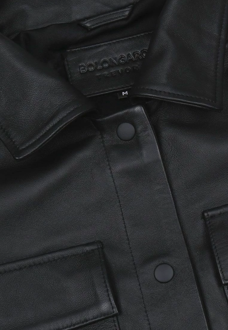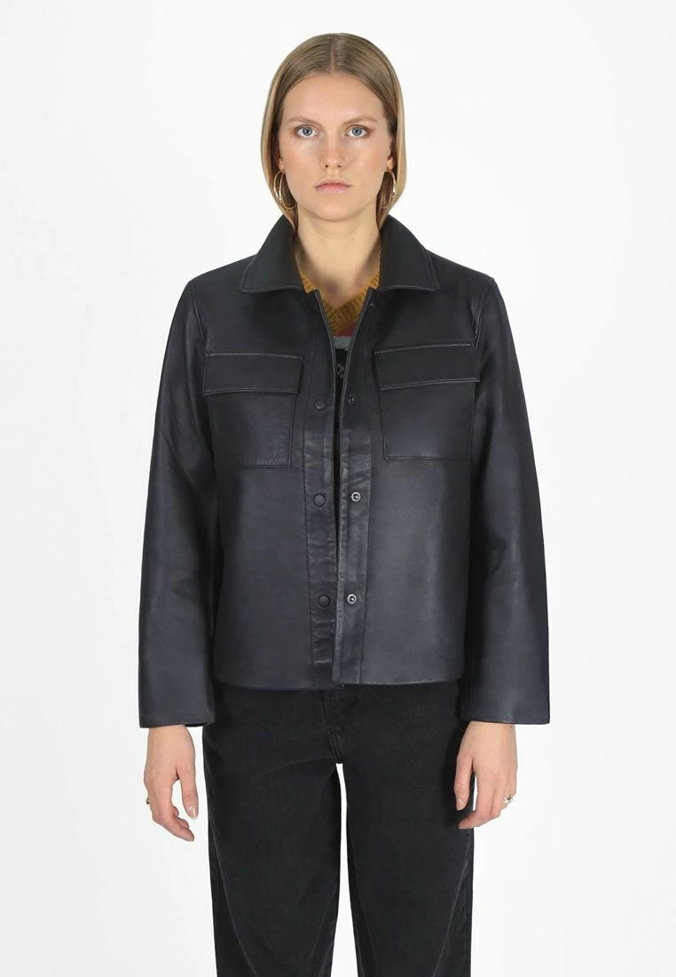 Workwear shirt style leather jacket with square pockets and press stud fastening.